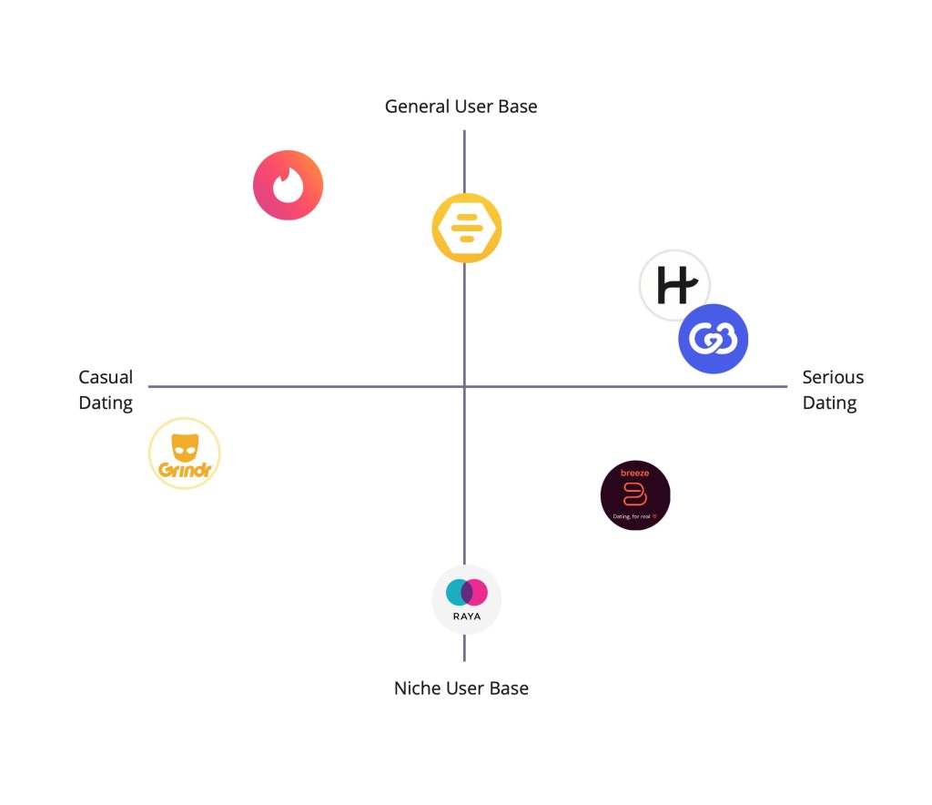 The first step was to define a roadmap to collect a variety of feedback, to understand the dating app landscape. For secondary research, brand audits on key competitors were conducted and illustrated in a perception map. Furthermore, information was scraped from online forums such as Reddit and Quora to inform the creation of user personas.